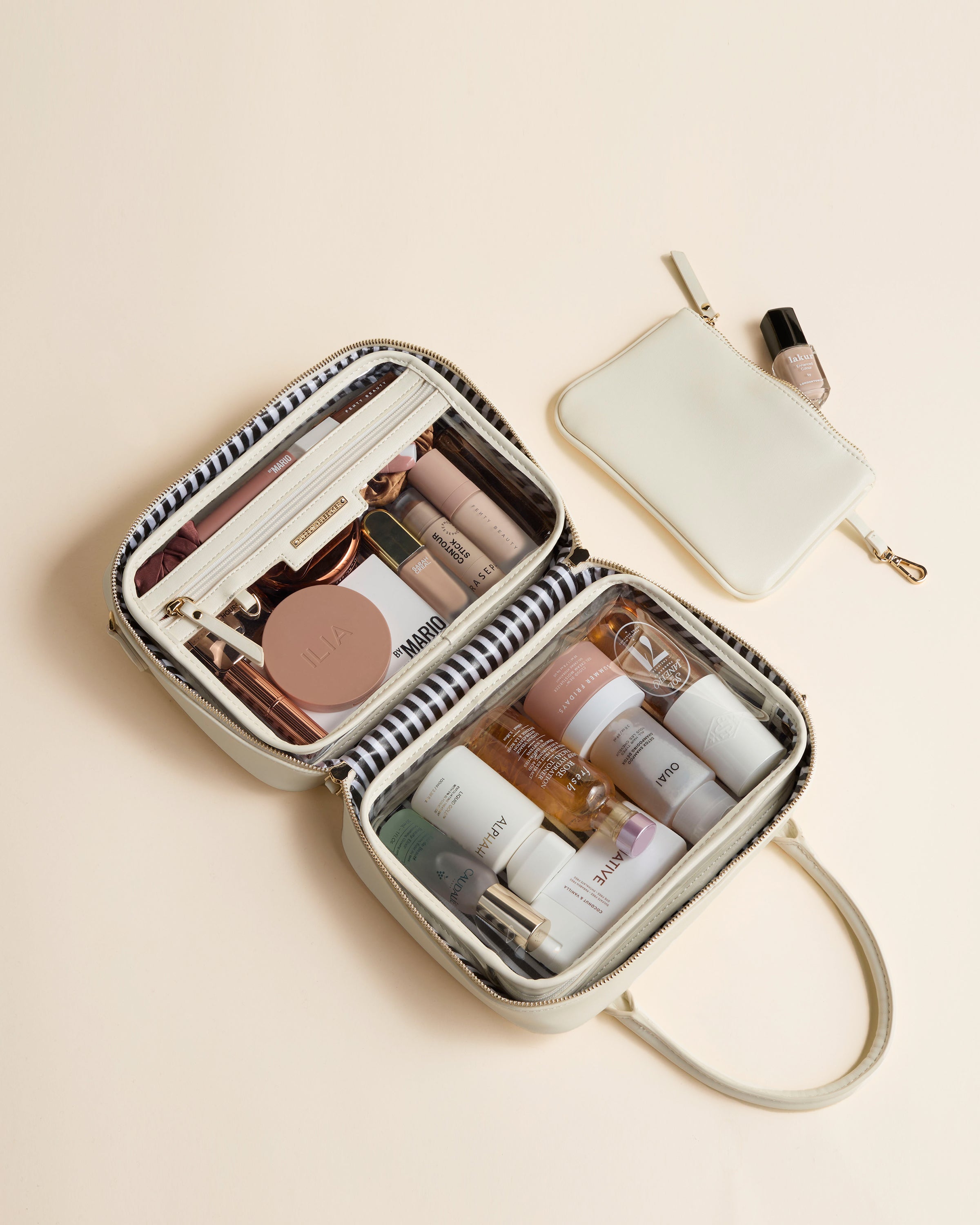Innovative lining repels spills and keeps your essentials hygienically fresh throughout your travels. Simply wipe clean with damp cloth or micellar water on a cotton pad.